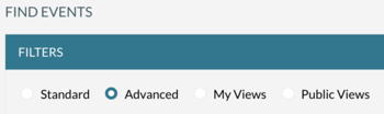The Find Events tool has the items most frequently searched for on the filter screen, so you don’t have to spend time looking for them. With the Standard filter, all you have to do is indicate what you want to search for—all events, all events for an organization, etc.—select the appropriate search parameter (e.g., Acme Industries), and choose a timeframe.