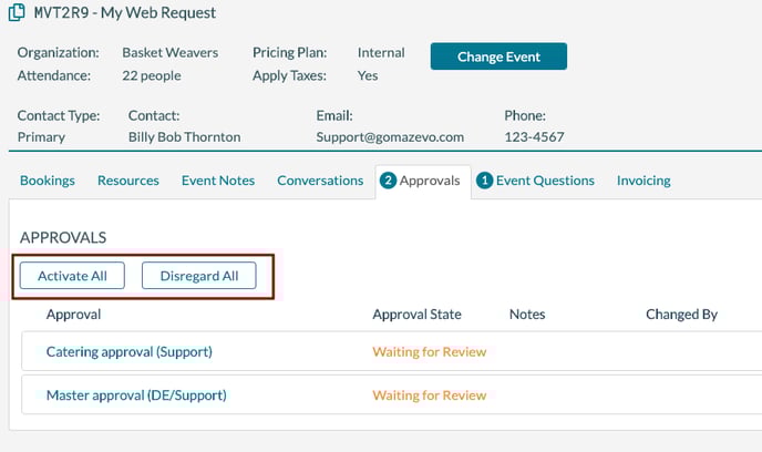 The event planner must activate event approvals to be visible to approvers. When the event planner clicks the Activate All button, the state is set to Pending for all event approvals. The event planner may also click Disregard All, which tells the system to ignore the approvals as if they never existed.