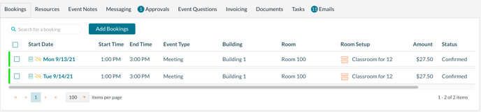 The Booking panel consists of tabs that represent various groupings of event information. They are Bookings, Resources, Event Notes, Event Questions, Messaging, Approvals, Invoicing, Documents, and Emails.