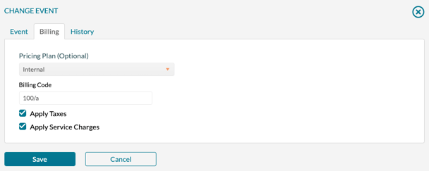 On the Billing tab, you can add or change the pricing plan or billing code, and check or clear the Apply Taxes and Apply Service Charges boxes.